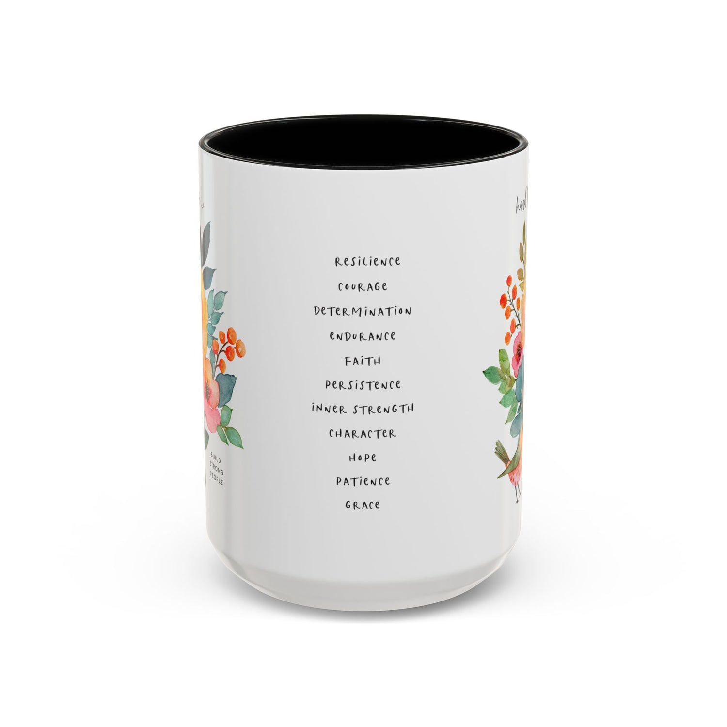 Motivational Coffee Mug – “Hard Things Build Strong People” with Flowers & Bird, Positive Gift for Her
